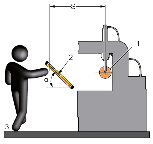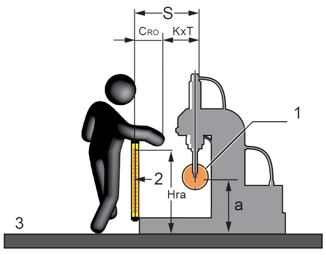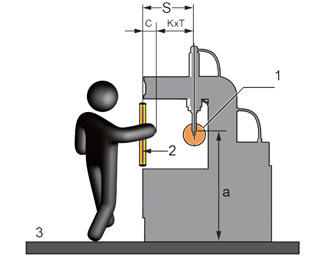 Эффективность защитных устройств зависит от их правильного расположения относительно опасной зоны. В частности, световые барьеры безопасности должны позиционироваться на расстоянии большем или равном минимальному безопасному расстоянию, чтобы доступ к опасной зоне обеспечивался только при полной остановке оборудования.
